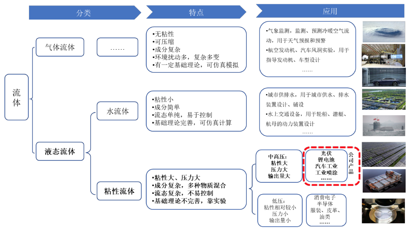 流体主要包括气体流体和液态流体两大类,盛普股份主营业务为液态流体中的粘性流体(主要为胶粘剂)控制设备,胶粘剂具有粘性高、压力大、成分复杂、流态不易控制、基础理论不完善等特点,因而需通过复杂计算和大量实验,构建流体运动模型,方可开发出高精度的流体控制产品。