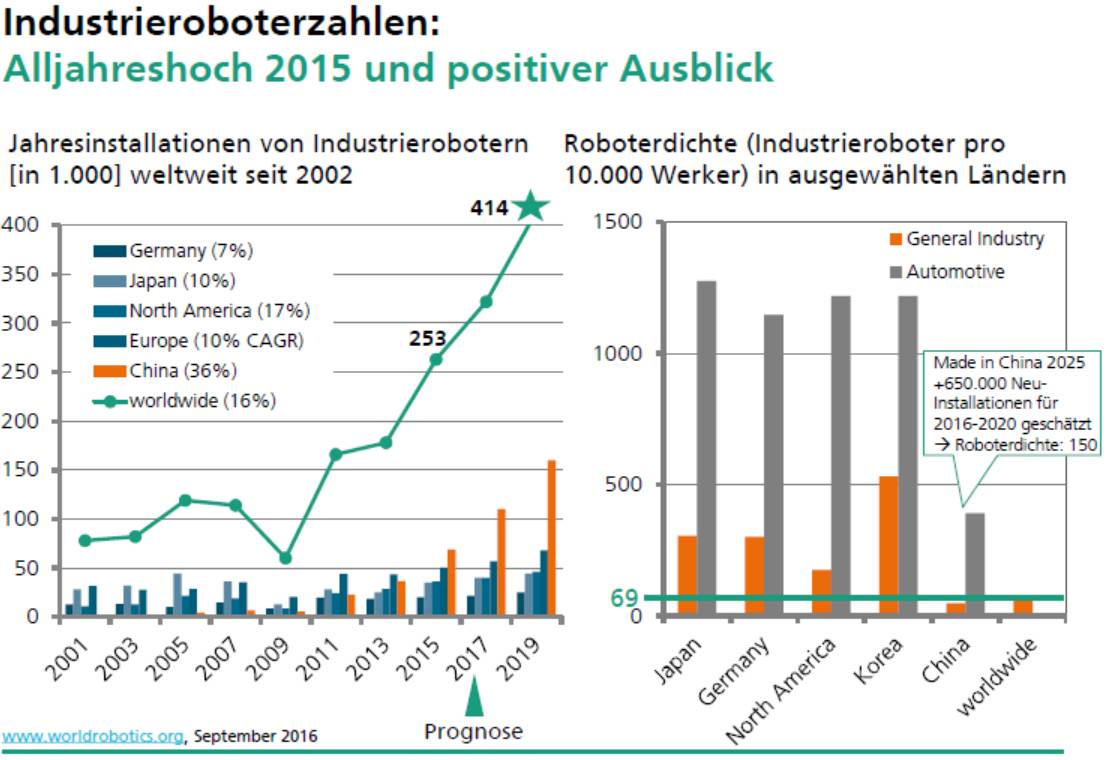 从各个国家的分布来看,从2011年开始中国成为全球最多安装案例国家,在2019年中国将远远超过德国、日本、欧洲和北美,占据全球36%的安装案例。但就机器人使用密度(每一个工业机器人在1万员工的使用比率)而言,与日本、德国、北美和韩国等机器人集中应用于高自动化汽车行业的密度相比,中国汽车行业的机器人使用密度却还远远低于以上几个国家。在“中国制造2025“的规划中,从2016年到2020年将有65万新的工业机器人被安装使用。