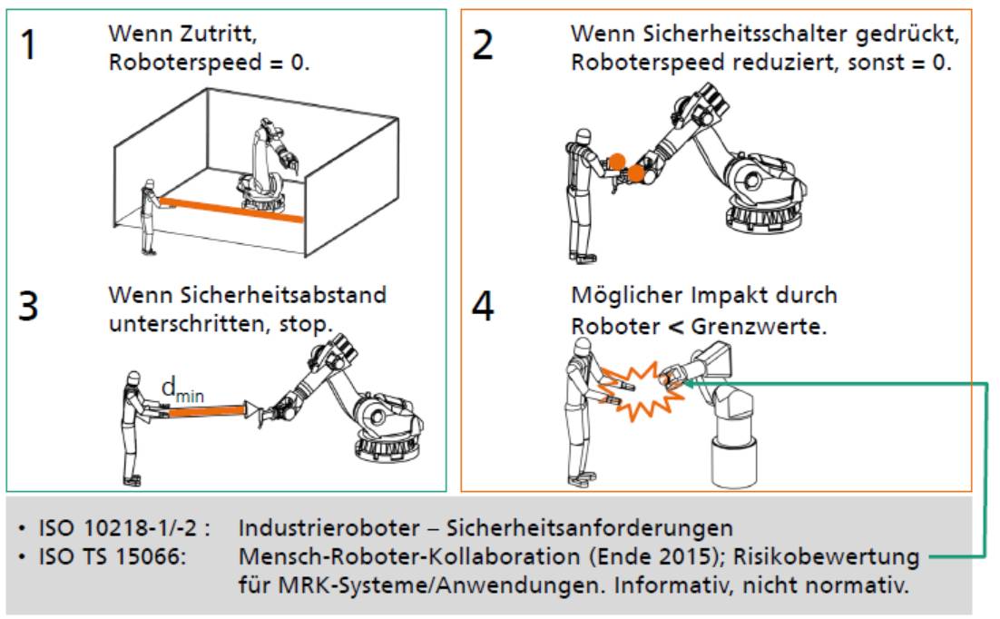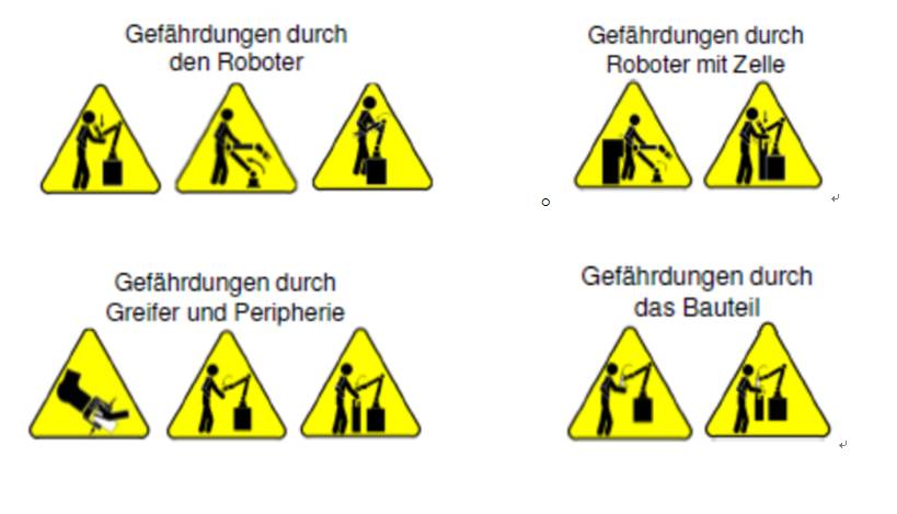 在DIN EN ISO 13849 以及DIN EN 62061的基础上,EN ISO 10218-1/-2 以及ISO/TS 15066:2016版本都有关于机器人安全需求的详细记载,前者是规定工业机器人的安全标准,后者是规定人机协作的安全标准,以及对于人机协作系统及应用的风险评估。安全需求分为四种案例,第一种案例是, 当人进入到具有安全防护栏的封闭或者开放式工作系统之时,机器人就立刻停下; 第二种案例是,在人引导机器人进行运动的情况下,当安全按钮被按住,机器人以缓慢的速度开始运动,反之则机器人保持静止; 第三种案例是对于人或物体位移速度和与机器人距离的监控,当规定的安全距离被打破的时候,机器人会停止; 第四种案例是在人与机器人有接触的情况下,对机器人功率以及力量的限制,使接触产生的影响力小于限定值。在ISO/TS 15066:2016中通过以下这些标志来对各种危害源进行归类和提醒。