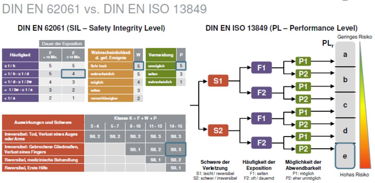 由于人机协作以及机器人应用隶属于机器设备,所在在介绍关于人机协作的安全要求前需要先介绍机器设备的安全要求,即DIN EN ISO 13849 以及DIN EN 62061。两个标准的侧重点不一样,DIN EN 62061 以SIL(安全集成等级)来作为评估级别,它主要从电器、电气以及可编程的控制系统这三方面来评估整个系统的安全等级,而DIN EN ISO 13849则以PL(执行等级) 来作为评估级别,着重于设备,从液压部件、压缩气体部件和机械部件,按功能安全要求去进行评估。下图是两种评估标准的案例。对应每个评估等级都有其相应的安全要求。