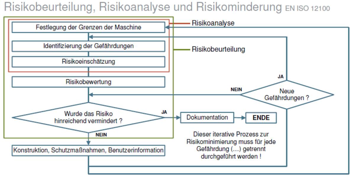 鉴于人机协作工作系统涉及到人身安全,所以在规划执行人机协作项目当中,除了要按照之前提及的标准定义项目的安全等级外,还要根据EN ISO 12100对项目进行风险评估,风险分析以及采取措施降低风险。具体的流程安排如下,首先是对整个工作系统的界定,哪些包含在系统内,哪些不属于,在定义系统的范围之后,就需要来识别系统中有哪些危险源,然后对于会产生的风险来进行相应推测 (此三部被称为风险分析)。针对推测出来的风险进行风险评估,并判断这个风险是否能够成功规避 (至此被称为风险评估)。 如果风险可以被规避到可以接受,那就需要去做文档记录并结束对此项的评估。 如果这个风险不能够被规避,则需要通过变更系统设计,添加额外的安全保护措施或者更新操作指导书并提醒操作员工相关注意事项。在决定采取这些措施之前,仍然要判断是否会因此产生新的危险源并经行新一轮的分析和评估,直至风险能够被规避并可以接受为止。