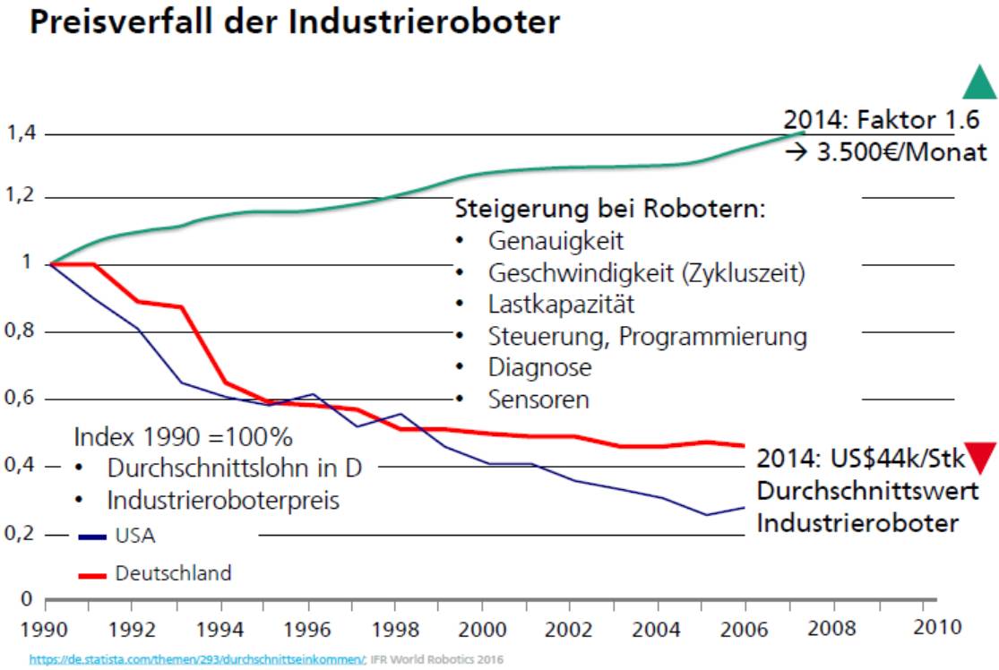 提高投资回报率,降低成本,是以上提到的工业机器人的第三个技术趋势。我们可以通过以上的图表可以看到,自1990年开始到2014年,工业机器人的成本在美国和德国平均成本至少降低了50%,在2014年,一个美国工业机器人的平均成本为44000美元,与此同时,随着科技的发展,机器人的很多性能得到进一步提高,具体体现在精确性、速度、负载、编程、控制、诊断、传感器方面。