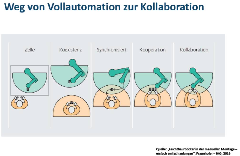 人机协作的应用前提,完全取决于生产产品的数量和产品品种的多少。一方面,当产品的数量对于全自动生产的方式而言太少,但对于人工生产方式而言过多,另一方面,当产品的品种种类对于全自动的生产方式而言太繁多,但对于人工生产方式而言又太单一,当这两个条件同时符合的时候就是人机协作的大施拳脚之际。随着工业4.0深入发展,智能产品层出不穷,产品会朝个性化、多样化发展,取代原先批量生产、品种单一的特征。人机协作也是在这样的大前提下应运而生,成为除了全自动、半自动、人工生产方式以外的第四种生产方式。