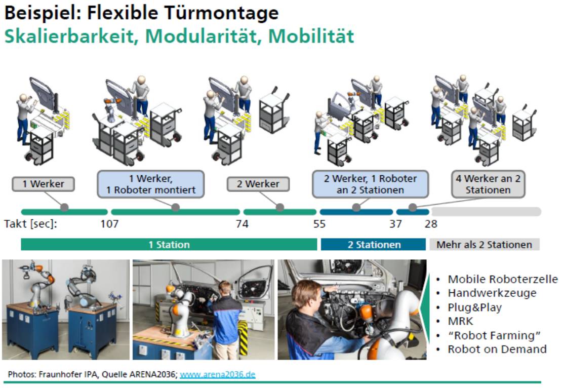 破除地域限制,参与可转变的柔性生产这个优点可以在下面的图表中显现出来。以柔性设计安装汽车车门为例,当生产节拍需求超过107秒的时候,一个工人就可以独立完成车门的安装;当节拍需求介于74秒到107秒的时候,一个工人和一个智能机器人可以协同去安装车门; 当节拍需求介于55秒到74秒的时候,有两个工人一起装配练车; 当节拍需求介于37秒到55秒的时候,两个工人和一个智能机器人就可以在两个不同的工位上进行协同装配; 当节拍需求介于28秒到37秒的时候,就可以同时有四个工人在两个不同的工位上面进行装配。智能机器人按照实际需求参与装配工作,使其有效使用率达到最大。