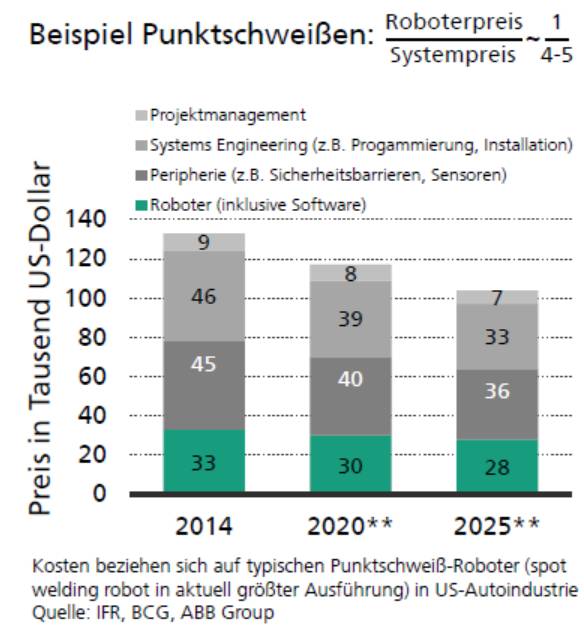 除了机器人本身的成本,还有整个系统的集成成本影响着机器人项目的投资回报率。机器人的成本与整个系统的成本比例,以点焊机器人系统为例,约为1:4到1:5。在2014年,小型点焊机器人以33000美元为基点,所有的安全防护措施及传感器的成本为45000美元,系统的编程安装以及集成为46000美元,项目管理为9000美元。随着工业机器人广泛运用,硬件,编程以及集成成本在未来的五年及十年内会大幅度下降,到2025年,机器人的成本会缩减到28000美元,安全防护措施会减少到36200美元,编程以及安装费用会减少到33200美元,项目管理费用会减少到7000美元。