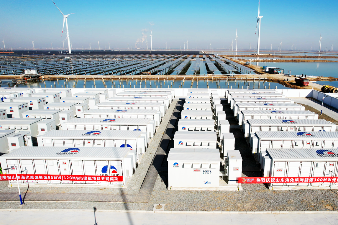 走进潍坊滨海区风光储智慧能源示范基地,波光粼粼的盐池水面上,一排排光伏板、一座座逆变器机组整齐排列,与蔚蓝的天空交相辉映。