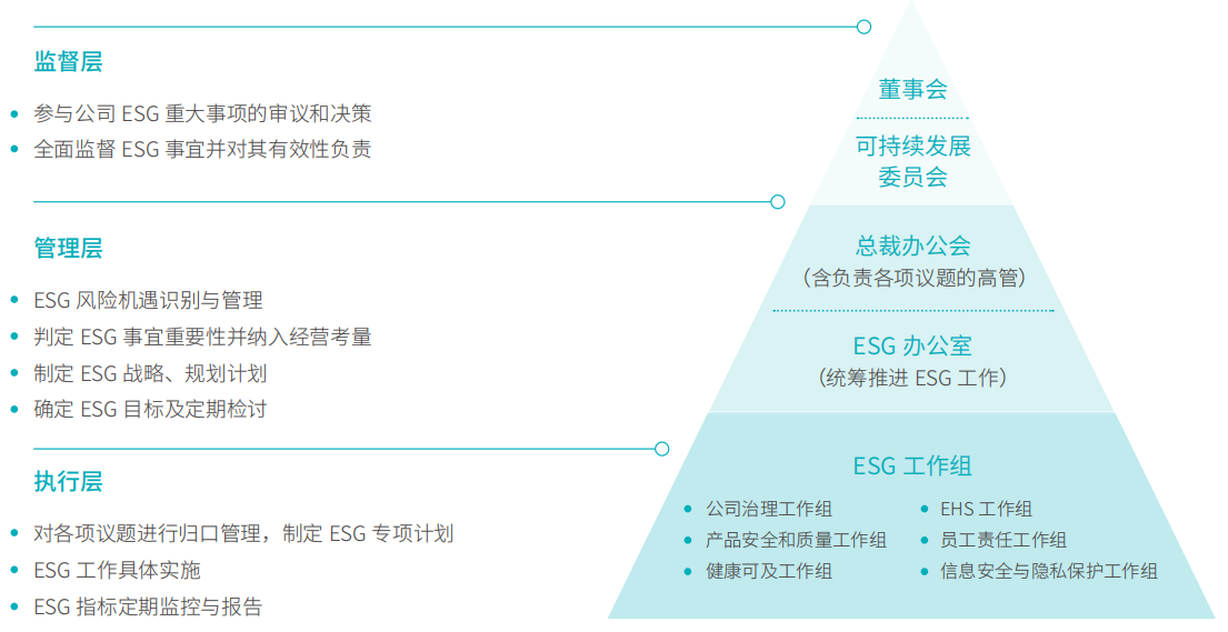公司已制定《ESG管理制度》并对外发布了十余项ESG政策,明确了ESG管理理念、原则及范围,为ESG相关工作的开展提供政策指引;设立可持续发展委员会,建立上下联动的ESG管理架构,确保形成行动高效、执行有力的ESG工作网络;构建系统化的ESG指标体系,让ESG工作看得见、可量化,自上而下将ESG管理要求融入到各职能部门的工作中,全面提升公司ESG风险控制能力和价值创造能力。