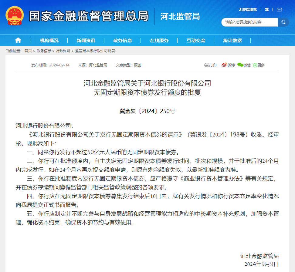 据国家金融监督管理总局网站显示,河北金融监管局同意河北银行发行不超过50亿元的无固定期限资本债券。