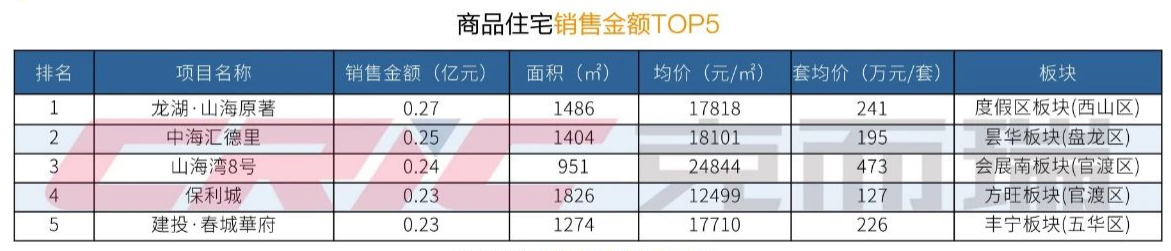 从“双榜”情况来看,市场两极分化现象持续。龙湖·山海原著、中海汇德里、山海湾8号、建投·春城华府4个高端改善项目霸榜商品住宅销售金额TOP5,成交均价在17000元/㎡以上。其中,会展片区的山海湾8号价格最高,为24844元/㎡。