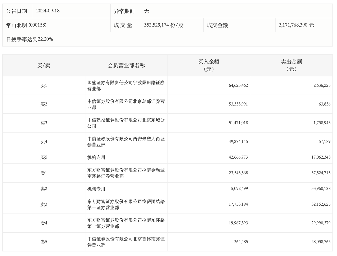 9月18日,常山北明今日涨停,龙虎榜数据显示,上榜营业部席位全天成交5.11亿元,占当日总成交金额比例为16.12%。其中,买入金额为3.28亿元,卖出金额为1.83亿元,合计净买入1.45亿元。