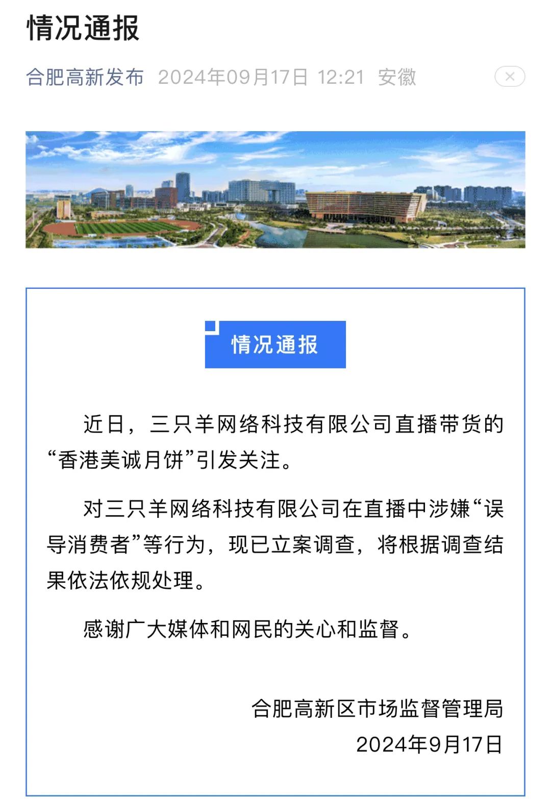 而在9月17日中秋节当天,合肥市高新区市场监管局在“合肥高新发布”微信公众号发布情况通报,对三只羊网络科技有限公司(简称“三只羊”)在直播中涉嫌“误导消费者”等行为,展开立案调查。