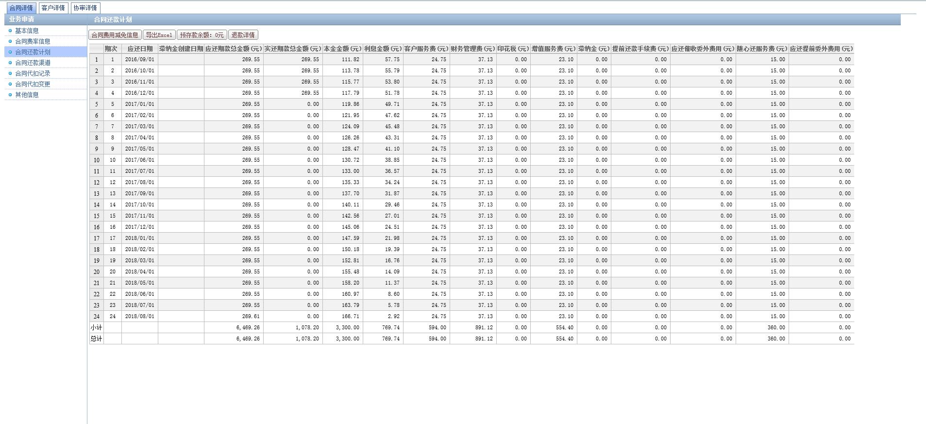事情的真相究竟如何呢?野马财经通过“佰仟金融内部人士”张卫(化名)拿到了一张佰仟金融的还款单,我们可以看到,以用户借款3300元分期24期为例,需要缴纳每月1.75%的利息(合计769.74元),其余还需要缴纳客户服务费594元;财物管理费892.12元;增值服务费554.4元;随心还服务费360元。其中利息总金额为借款本金的23.3%,但其他各项收费(逾期除外)高达2399.52元,为借款本金的72.7%,利息、费用合计3169.26元,两年的借款成本高达96%。详见下图: