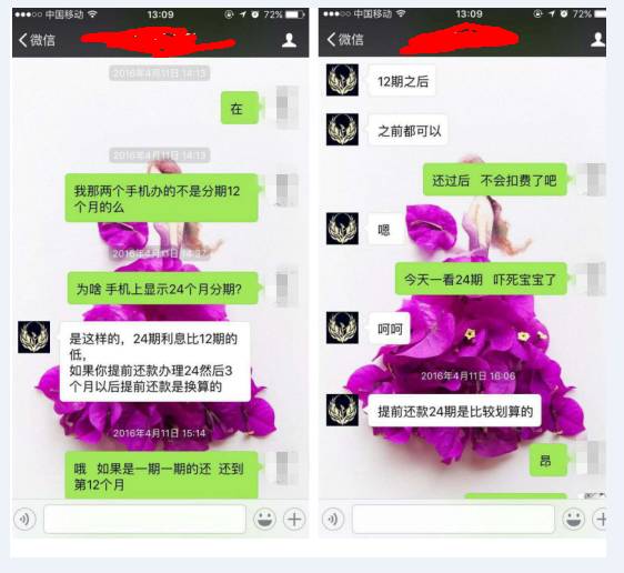 据王晓介绍,其之前在佰仟金融借款时本来是分12期,但是却莫名其妙变成了24期,而销售代表对她的解释是“提前还款24期是比较划算的”,详见下图她和该销售代表的微信聊天记录:
