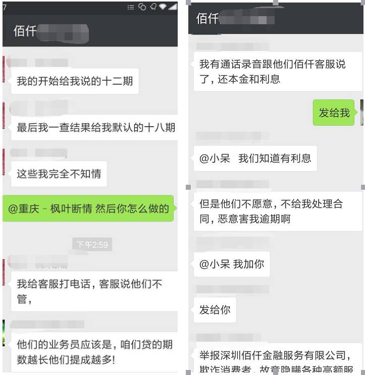 用户投诉目前主要集中于消费金融领域。佰仟金融借款人孟女士声称:“办理分期时,佰仟门店的业务人员只告知她要收取本金和利息,其他费用提都没提”;另一位借款人王晓(化名)则反映:“佰仟金融的风险提示根本没有,自己借的是12期结果莫名其妙就变成24期了,不仅利息翻倍,还增加了很多之前没有提到的费用。”等。而众多认为自己受骗上当的借款人也组织起了规模庞大的QQ、微信等维权群。