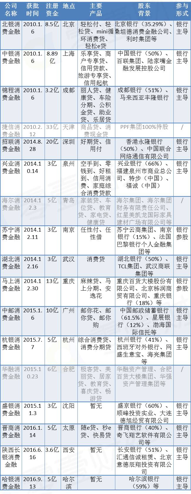 野马财经(微信公号:ymcj8686)查询了银监会官网,发现在2016年9月之后,银监会就没有发放新的消费金融牌照。据新媒体零壹财经统计显示,目前拥有银监会发放的消费金融牌照的公司共有17家。详见下图: