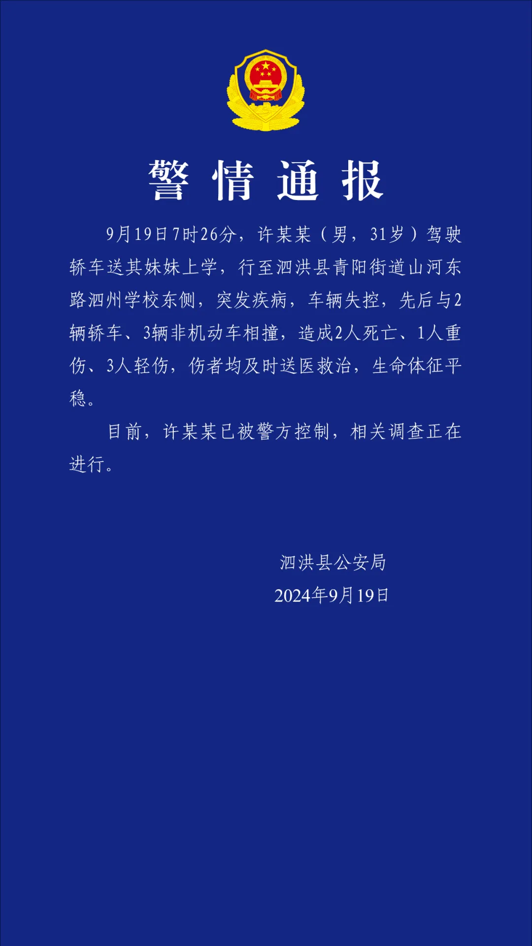 江苏泗洪县公安局通报,9月19日7时26分,许某某(男,31岁)驾驶轿车送其妹妹上学,行至泗洪县青阳街道山河东路泗州学校东侧,突发疾病,车辆失控,先后与2辆轿车、3辆非机动车相撞,造成2人死亡、1人重伤、3人轻伤,伤者均及时送医救治,生命体征平稳。目前,许某某已被警方控制,相关调查正在进行。