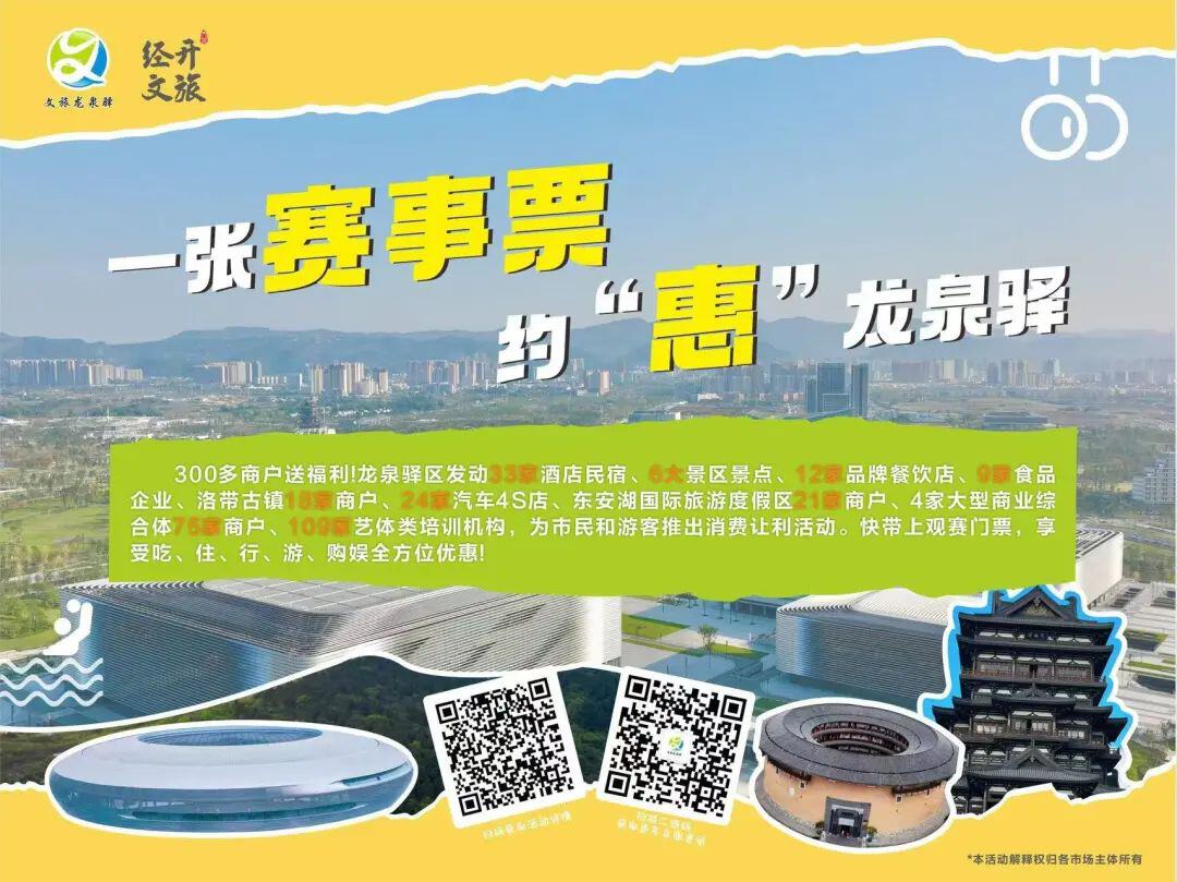 9月12日至10月12日,市民和游客凭观赛票(电子票)在指定地点消费可享打折等优惠,到店消费还有机会获赠门票,“吃住行游购娱”一站搞定,一起约“惠”龙泉驿吧!