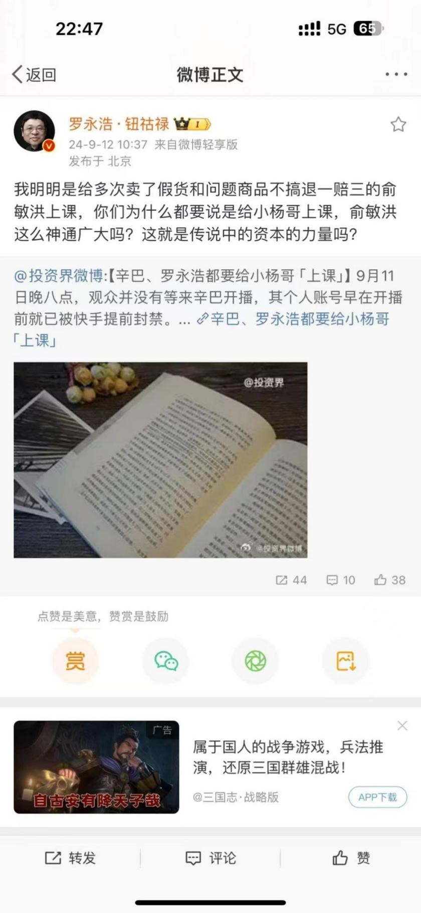 虽然罗永浩很快进行了澄清:只针对“多次卖了假货和问题商品不搞退一赔三的俞敏洪”,与小杨哥无关。