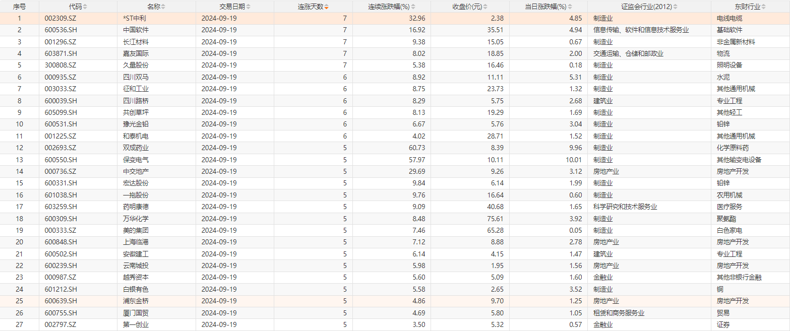 Choice数据统计,今日5只个股连续7天上涨,包括中国软件、长江材料等;6只个股连续6天上涨,包括四川双马、征和工业等;此外,双成药业、保变电气、中交地产等16只个股连续5天上涨。
