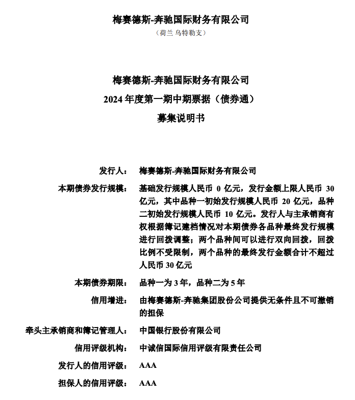 9月19日,梅赛德斯-奔驰国际财务有限公司在中国货币网公告,将于9月23日在中国银行间债市簿记发行2024年度第一期中期票据,金额合计不超过30亿元人民币。本期债券由梅赛德斯-奔驰集团股份公司提供无条件且不可撤销的担保,其中3年期品种初始发行规模20亿元,5年期品种初始发行规模10亿元。募集资金净额将全部划付出境用于一般公司用途。