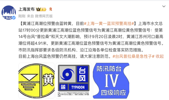 @上海发布 微博消息,上海市水文总站9月19日17时00分更新黄浦江高潮位蓝色预警信号为黄浦江高潮位黄色预警信号:受第14号台风“普拉桑”和天文大潮影响,预计9月20日凌晨2时,黄浦江苏州河口最高潮位将超4.91米,更新黄浦江高潮位蓝色预警信号为黄浦江高潮位黄色预警信号。上海市防汛指挥部要求各级防汛机构、沿江沿海各单位检查落实防范措施。