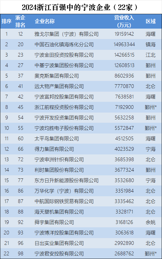宁波共有22家企业上榜。其中,雅戈尔在浙江百强中已排在第12位,8家企业进入榜单前50强。