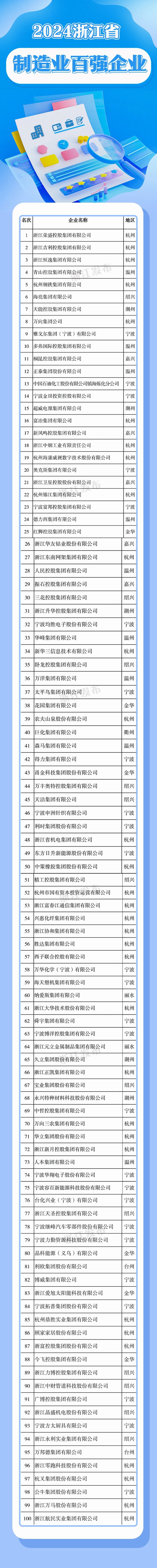 9月19日,浙江省企业联合会、浙江省企业家协会、浙江省工业经济联合会发布2024浙江省百强企业榜单。这也是自2003年以来连续第22次向社会公开发布年度浙江省百强企业榜单。