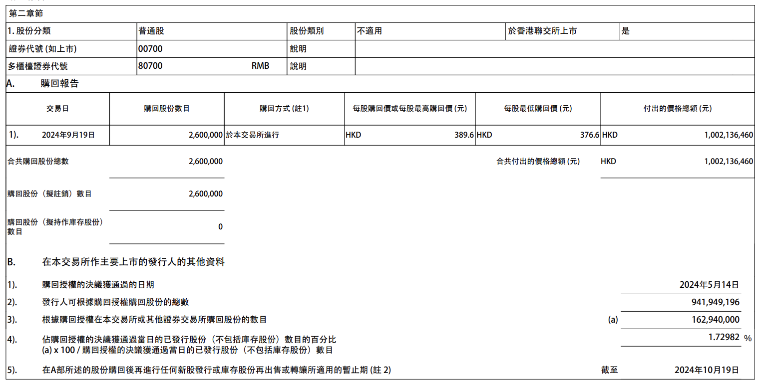 腾讯控股9月19日在港交所公告,于当日回购260万股公司股份,每股回购价格为376.6港元-389.6港元,共耗资约10.02亿港元。