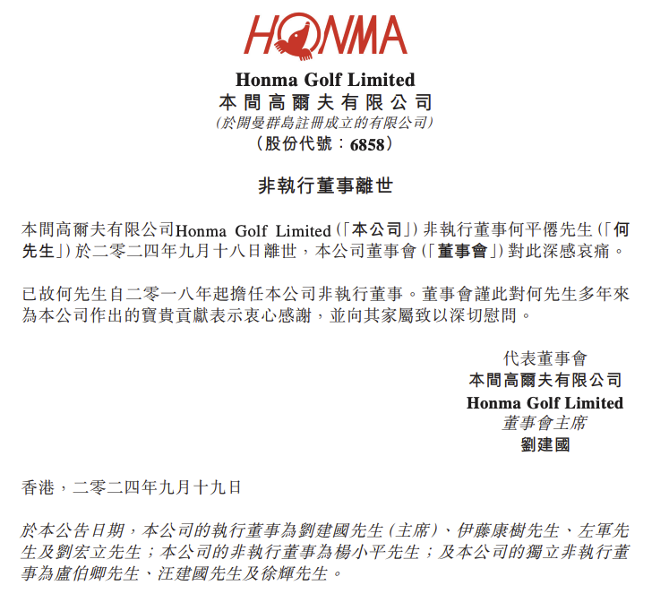 9月19日,本间高尔夫在港交所公告,公司非执行董事何平仙于2024年9月18日离世,公司董事会对此深感哀痛。已故何先生自2018年起担任公司非执行董事。