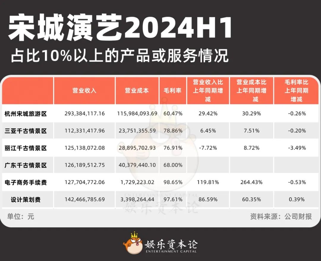 在众多演艺类公司中,宋城演艺在营收增长、毛利率等指标上都最为亮眼。其中,“大本营”及“试验田”杭州宋城,其贡献领先其他景区与业务。根据宋城演艺年报,2024上半年的业务增长由景区运营天数和游客人次大幅增长双重驱动。