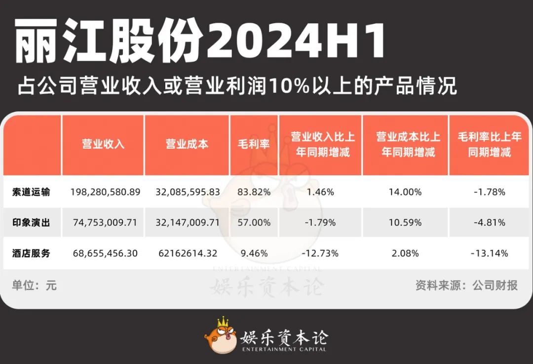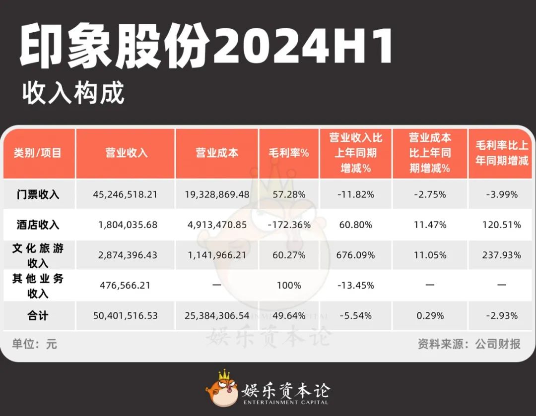 无论是《印象·丽江》还是《印象·大红袍》,在2024上半年的营收的毛利率都较去年同期发生下降。这种依托当地旅游资源,单独运营演艺业务的模式,使得这类演艺企业在收入模式上趋近于景区类企业——不仅存在收入来源单一的风险,而无法通过复制已有经验获取规模效应的局限性也使其在资本市场上乏善可陈。