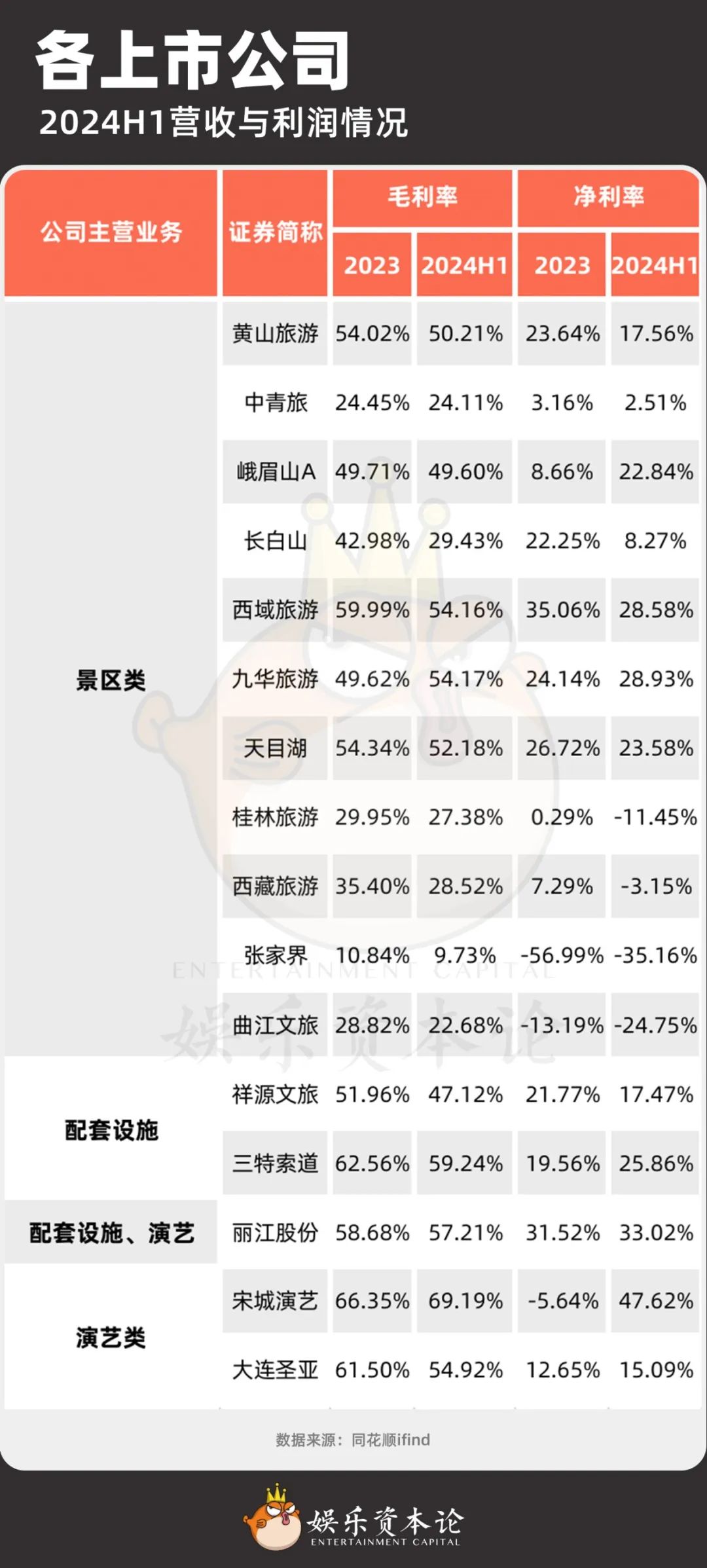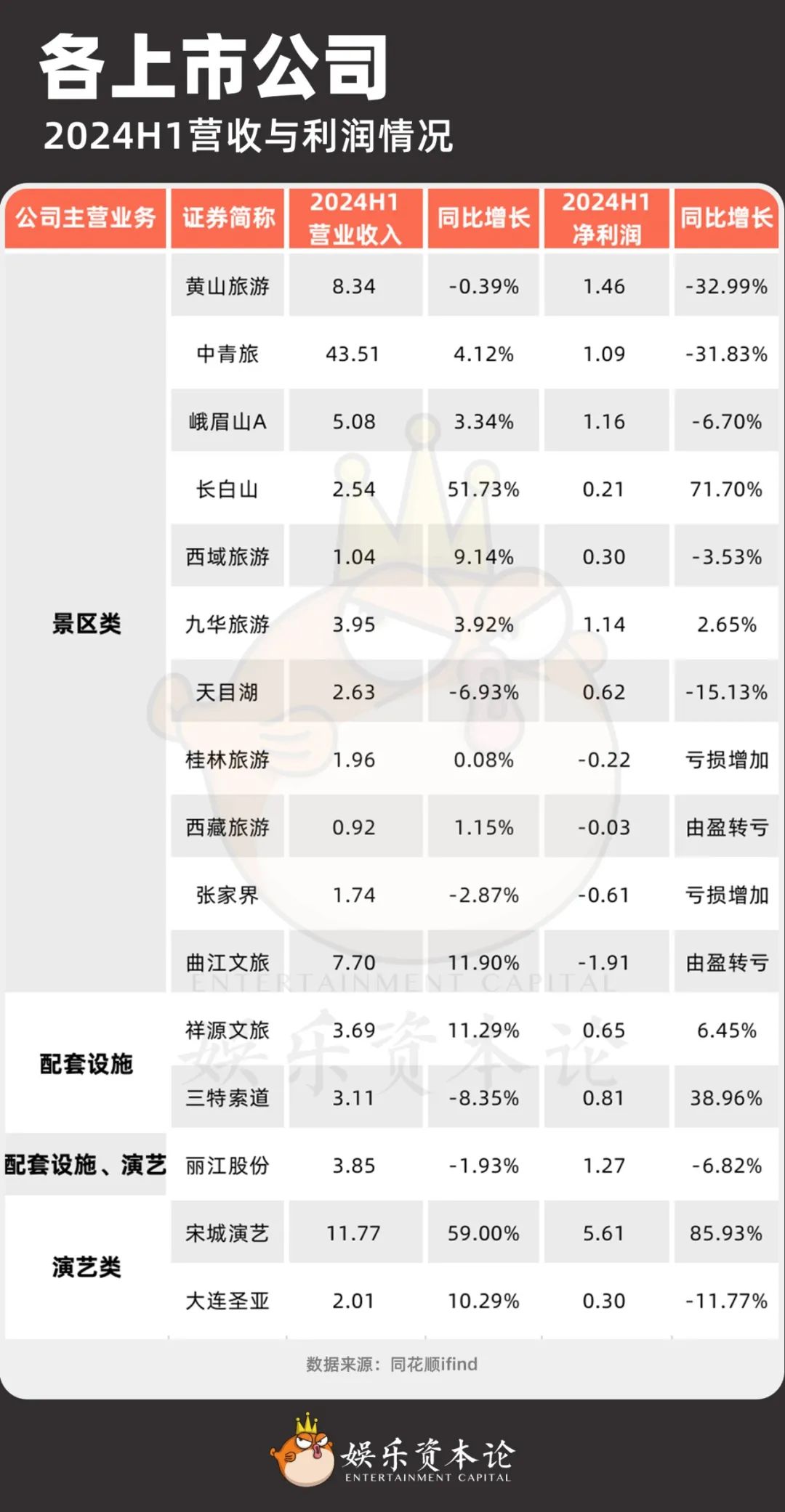 我们选取与文旅直接相关16家上市企业,发现文旅企业正面临前所未有的竞争困境:从16家企业的2024半年报来看,除长白山、宋城演艺营收增长显著高于国内出游总消费增速(19%)外,其他多数企业上市公司营收增长缓慢,甚至出现负向增长;从利润端来看,16家企业仅有五家实现利润增长,发生亏损的四家企业中,两家亏损扩大,两家由盈转亏。