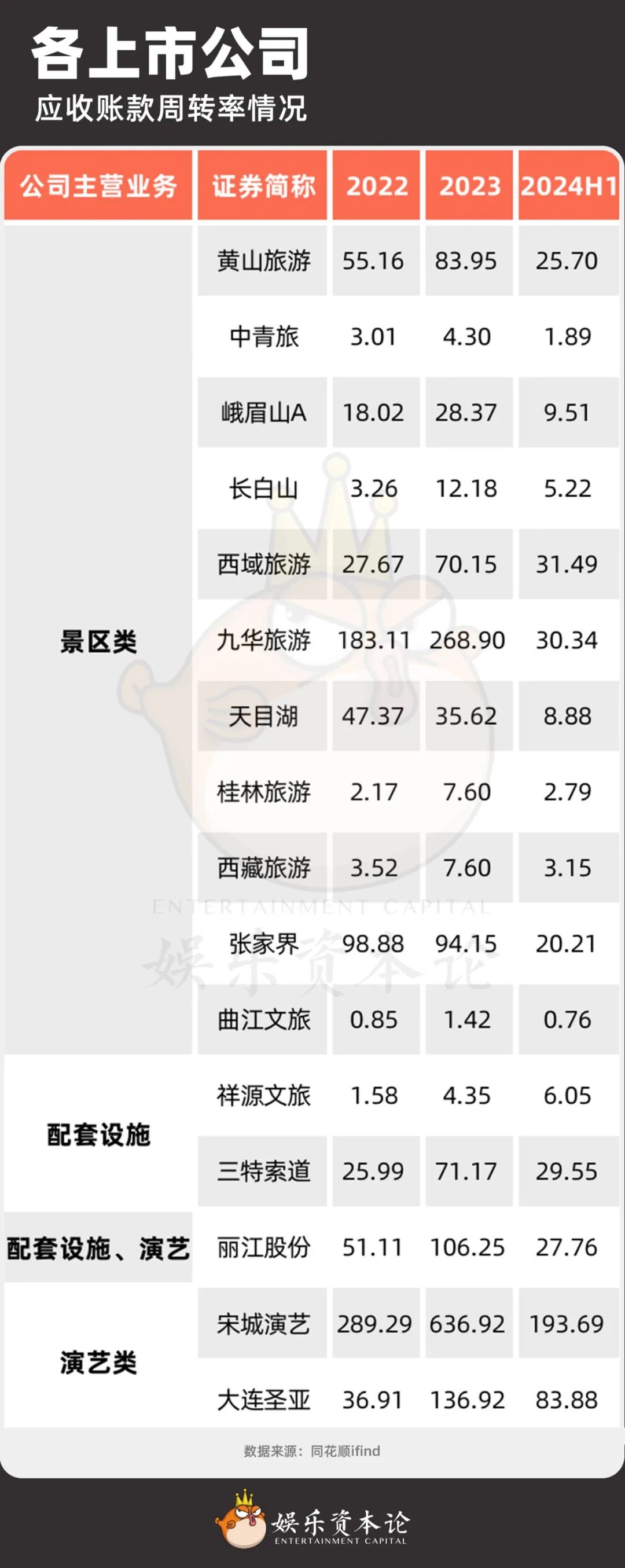 应收账款是景区类公司的共性问题。除了少部分景区类公司(如黄山旅游、西域旅游、九华旅游等)应收账款周转率(营业收入与平均应收账款比值)表现正常外,包括中青旅、峨眉山、长白山在内的众多景区类公司周转率均处于较低水平,而曲江文旅则位于全部旅游公司的最低值。相比较而言,民营的演艺类公司,则未出现相似的应收账款问题。