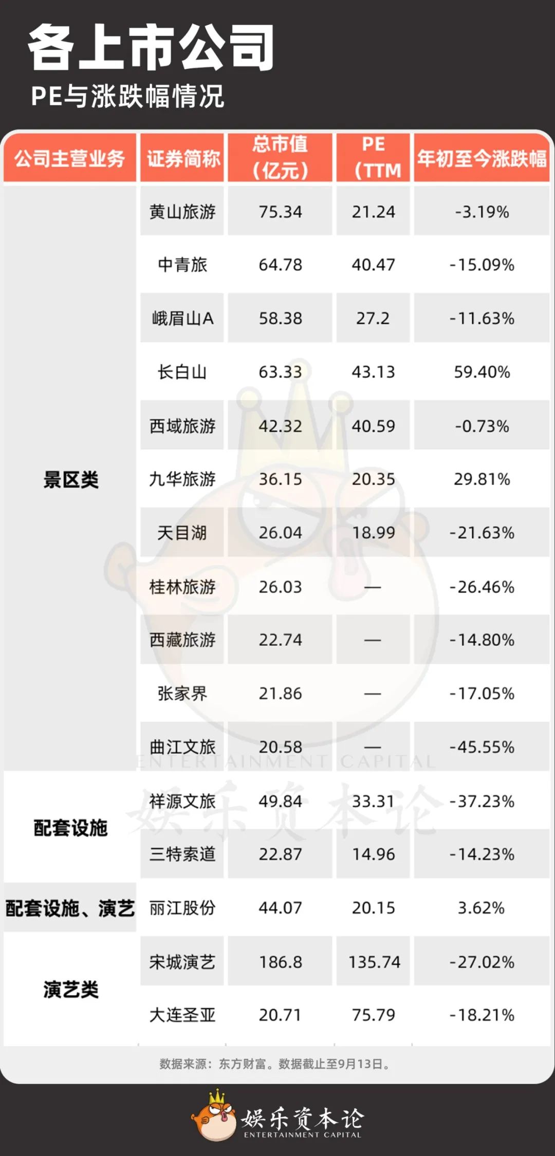 从资本市场对16家上市公司的反应来看,演艺类公司的估值普遍高于景区类公司,表明了资本市场对于演艺业务的看好,与文旅产业向演艺方向探索的趋势相呼应。