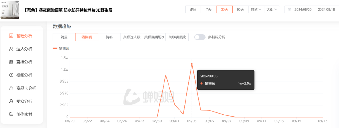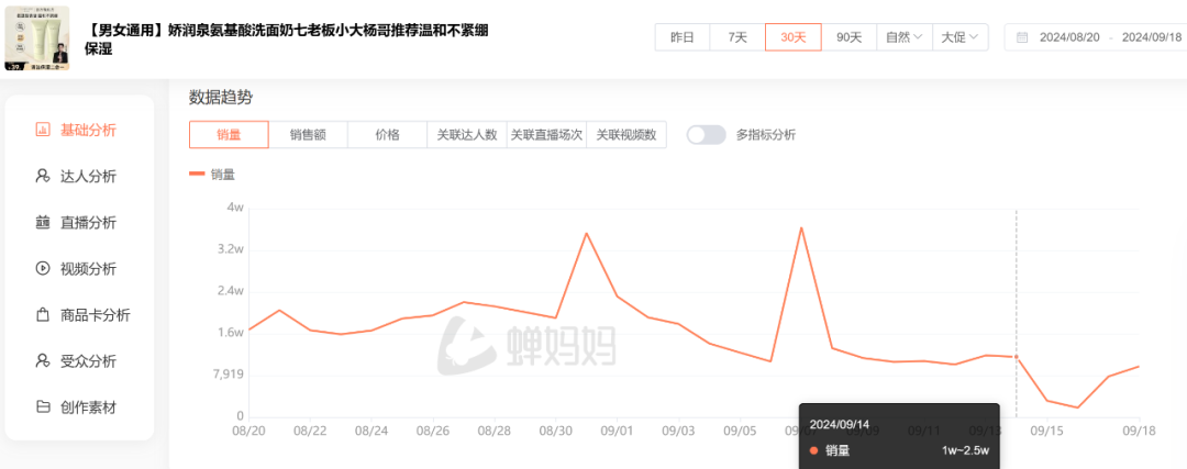 受本月风波影响,其爆品“娇润泉氨基酸洗面奶”销量也在近30天出现了明显的波动,9月14日之前,其销量至少不低于1W,但从15日开始销量跌破5000,16日,更是只剩1000-2500。