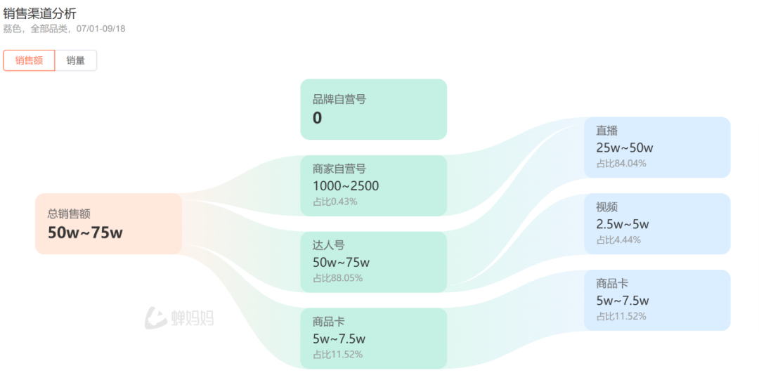 据蝉妈妈数据,荔色主要销售额来源为“达人号”,带货占比超88%,商品卡占比11%,商家自营号占比近0.43%。带货达人均为三只羊网络旗下达人,包括七老板、疯狂小杨哥、卓仕琳、疯狂大杨哥(日常)、三只羊网络等。