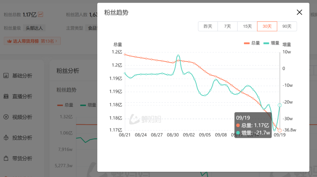 蝉妈妈数据显示,近30天内,除9月17日外,“三只羊网络”每日直播,日均观看人次165.1万,日均销售额100w至250w。销售额于9月1日达到750万元至1000万元的高峰,其后逐渐走低,16日销售额10万至25万元。从数值来看,半个月骤降90%以上。自9月17日至今,“三只羊网络”粉丝量跌去3.4w,近30天,粉丝减少16.9w。