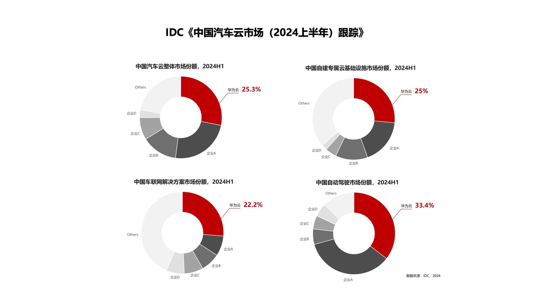 华为云副总裁(战略与产业发展部总裁)黄瑾在论坛上发表主题演讲,他表示:“华为云基于5大创新,支撑车企全球化、网联化、智能化、软件化、数字化的发展,我们会持续加大投入,助力车企和伙伴构建新的技术韧性,一起云上升级,行稳智远。”华为云自成立以来就与汽车行业客户及伙伴携手同行,通过与产业多方持续深入的合作,积累了丰富行业数智升级经验,致力于成为汽车产业升级的最佳伙伴,IDC《中国汽车云市场(2024上半年)跟踪》显示,华为云再度斩获了中国汽车云市场份额第一,车联网云服务和自动驾驶云服务等多个第一。