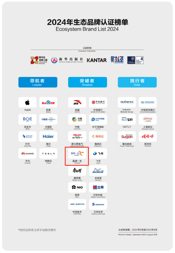 9月19日,由新华社品牌工作办公室、新华出版社、凯度集团、《财经》杂志、牛津大学赛德商学院共同主办的2024(第三届)生态品牌大会在青岛举行。本届大会以“生态无界,价值无限”为主题,深入探讨“生态品牌—生态企业—生态经济”的时代新范式,并发布了2024年生态品牌认证榜单。其中,盈康一生凭借打造的大健康生态新范式,入选生态品牌“突破者”象限,成为连续两年唯一上榜的大健康生态品牌。
