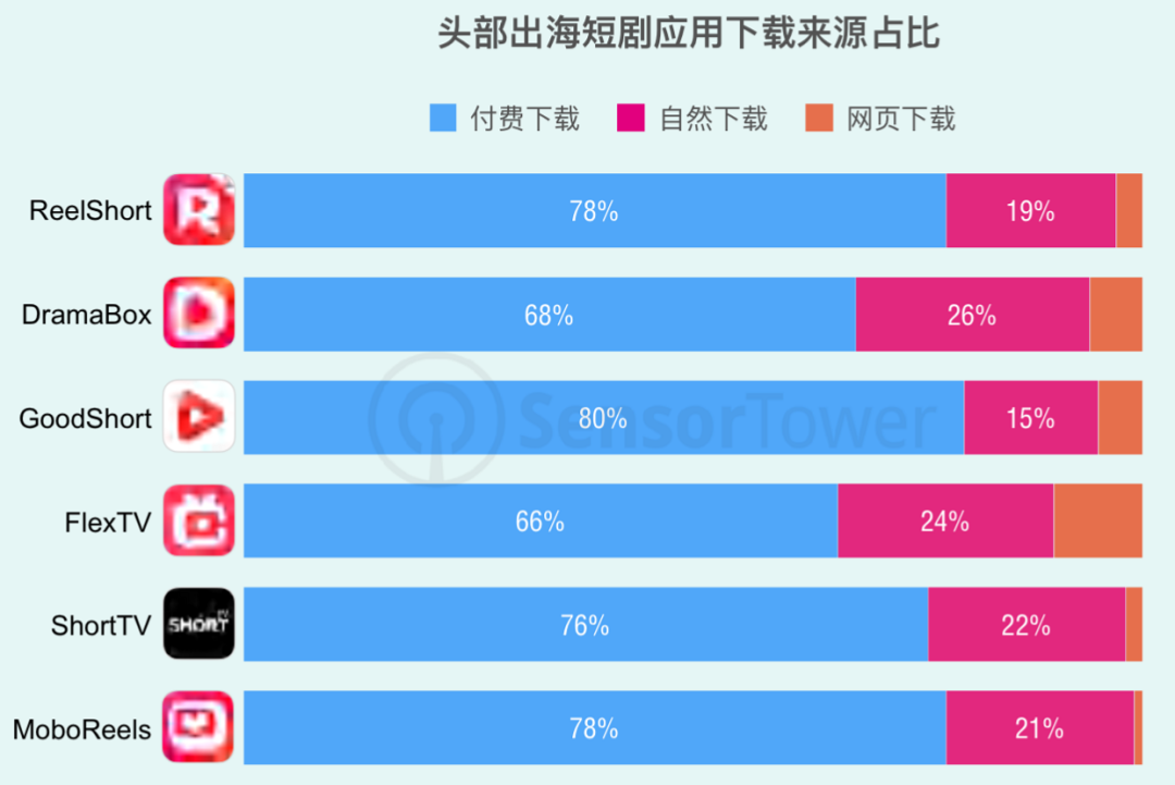 《Sensor Tower报告》数据显示,今年2月,头部出海短剧应用的付费下载占比几乎都在65%以上。尤其是当平台产出爆款作品时,投流产出的获客比例更大,此前,ReelShort爆款短剧《Fated to My Forbidden Alpha》热播期间,平台付费下载占比一度达到90%。