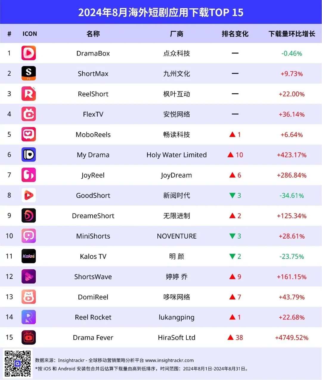 收入爆发往往伴随着下载量的激增。Insightrackr数据显示,今年8月,海外热门短剧应用中,多款产品下载量都保持三位数的增长。其中,于7月末刚上线的Drama Fever迅速跻身海外短剧应用下载TOP15,下载量更是环比增长4749%。显然,海外短剧市场的发展如火如荼,短剧出海已然进入暴涨期。