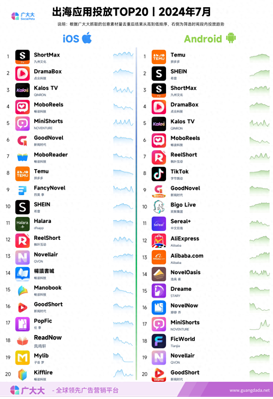 受此影响,在海外短剧爆发的初期阶段,各家都在“跑马圈地”的关键时期,海外短剧应用投流力度整体加大。广大大数据显示,2024年7月出海应用投放TOP20的榜单中,IOS端的投放TOP7都是短剧应用,安卓端投放靠前的平台中,也有不少短剧APP。