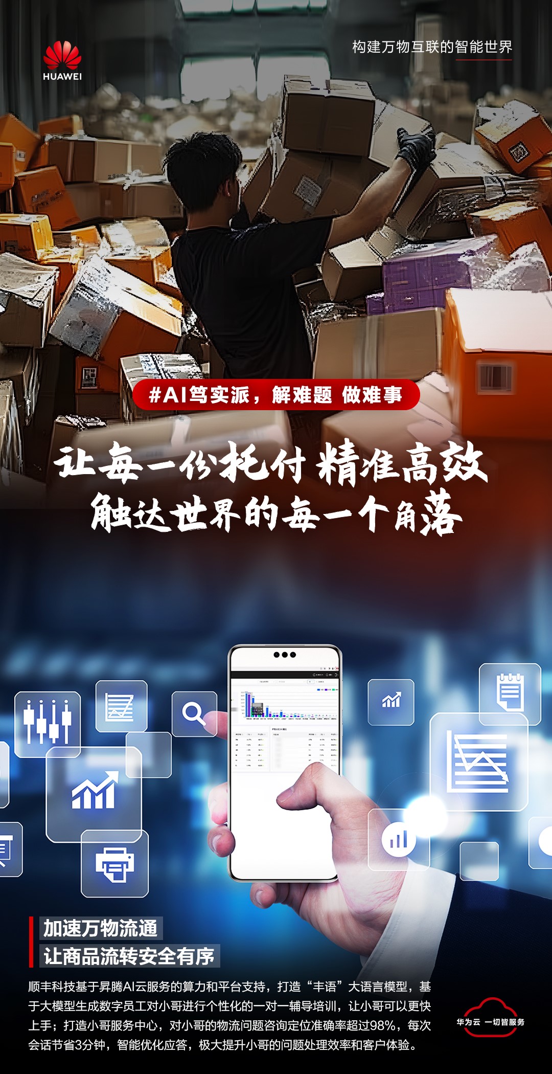顺丰作为物流行业的龙头企业,借助华为昇腾AI云服务,利用物流行业知识及物流供应链的数据,构建了自己的丰语大语言模型,经过预训练、监督微调以及基于人工反馈的强化学习后,将大模型渗透到顺丰物流的员工服务、客户服务、物流下单、物流审单以及清关等众多环节中。在客服工作台,实时获取和反馈物流信息是保障服务效率的关键,在丰语大模型的帮助下,通过优化信息抽取功能,使实时物流信息抽取错误率降低了52%;在国际物流中配送,针对不同国家对收寄物品有不同的标准和要求,借助丰语大模型改进对物品名称的改写功能,使收寄物品名改写错误率降低了42%。这些看似微小的变化,放到在巨大的产业产值面前,就是巨大的经济效率。