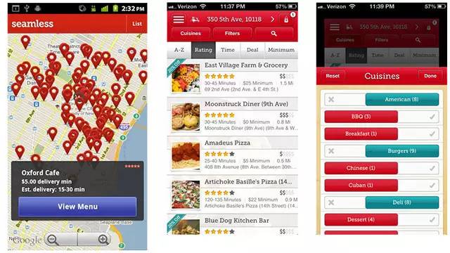 Seamless,饿了么的鼻祖,性价比和方便程度都很高的,是非高级餐厅订餐APP中用户评价最好的。覆盖城市广,合作餐馆多,部分餐厅免运费。最突出的特点是餐厅搜索系统很强大,用户可以从餐厅评价、价格、距离、送餐费用和料理种类等多个方面同时筛选餐厅。而且订单状态的更新可以通过短信提醒,小编觉得会比APP推送方便一点,尤其在WiFi不那么流畅的时候。但Seamless也有做的不好的地方,比如送餐时间的预估范围太大。。。