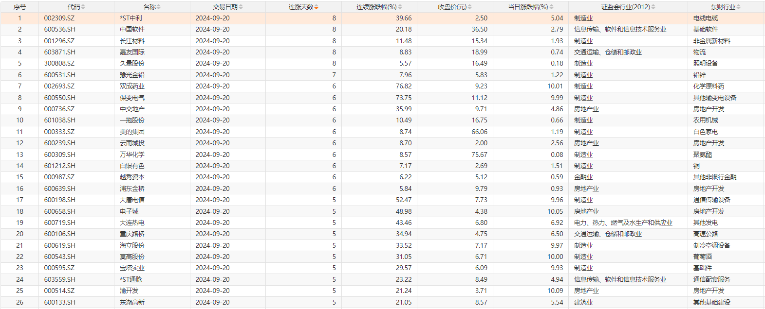 Choice数据统计,今日5只个股连续8天上涨,包括中国软件、长江材料等;1只个股连续7天上涨,为豫光金铅;此外,双成药业、保变电气、中交地产等10只个股连续6天上涨。