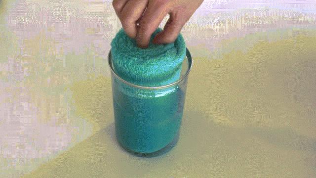 为了检验智能毛巾的吸水性,我们也做了一个小测试。将毛巾卷成一团后,放入装有清水的容器中。