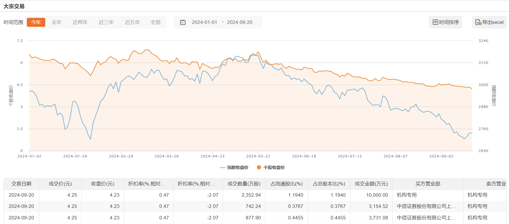 9月20日,华铁应急今日大宗交易成交3973.08万股,成交额1.69亿元,占当日总成交额的64.65%,成交价4.25元,较市场收盘价溢价0.47%。