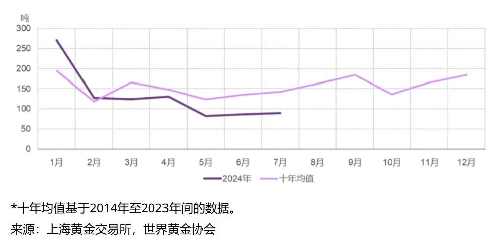 中国黄金协会统计数据显示,今年上半年,过去一直表现较好的黄金首饰消费量,同比下降了26.68%。上海黄金交易所和世界黄金协会发布的数据显示,今年二季度中国市场金饰需求创下了十年均值(2014至2023年)的同期新低。