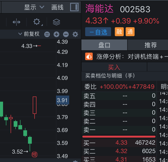 海能达(002583.SZ)9月19日至20日连续2天涨停,20日直接“一字涨停”,19日的换手率还有9.25%,20日直接降为2.11%。9月19日海能达龙虎榜显示,深股通专用席位在当天做T,买入1650.27万元,卖出2968.35万元。