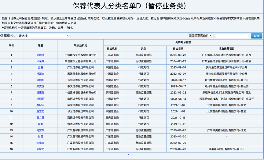 根据中证协公示,首批D类保代名单共计16人,其中,涉及海通证券、中信建投、广发证券、中金公司、东北证券等多名保代。所涉及的保荐项目均曾因财务造假、虚假陈述等在A股市场引起强烈关注,并最终受到严厉处罚,如美尚生态、康美药业、蓝山科技紫晶存储、乐视网等项目。